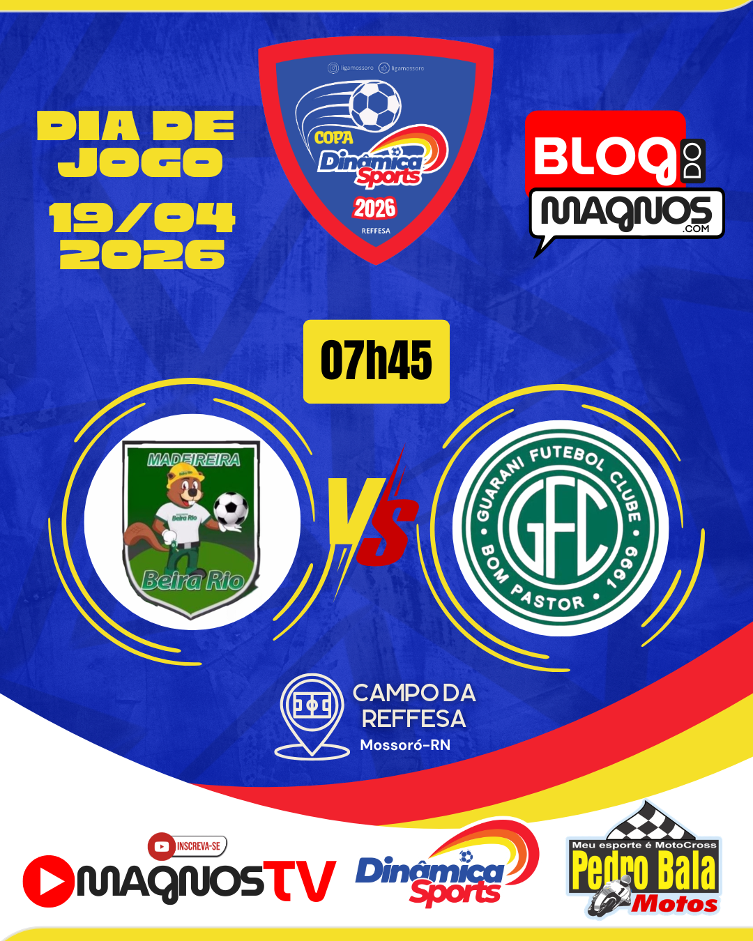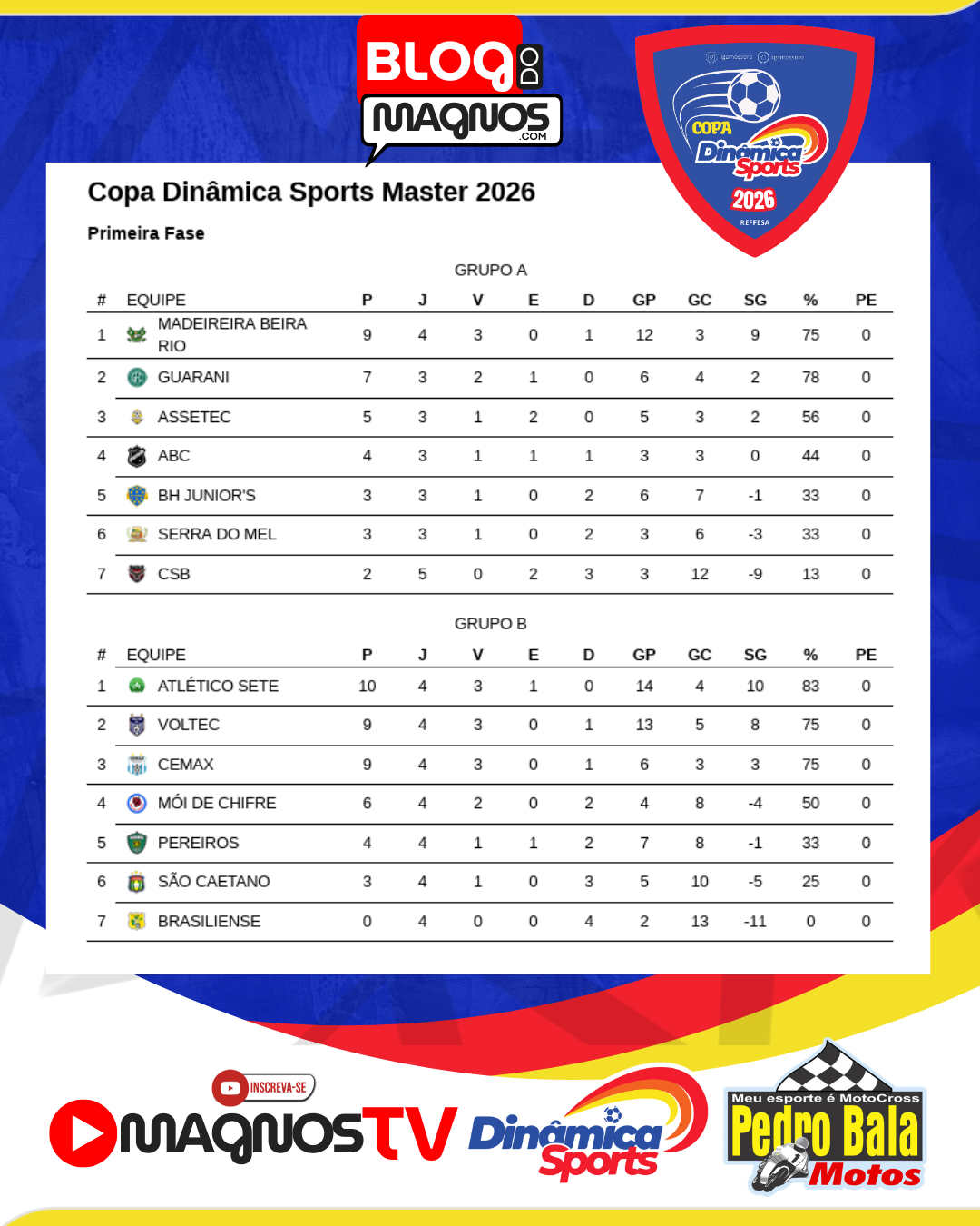 A Copa Dinâmica Sports Master 2026 é uma realização da Linerik Comunicação e Eventos, com patrocínio máster da Dinâmica Sports e apoio de Pedro Bala Motos.