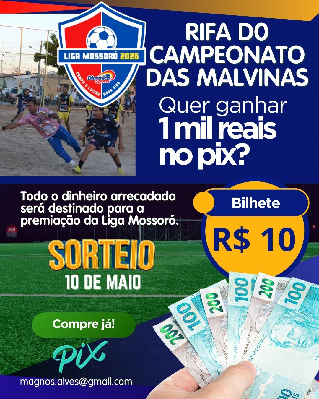 Para viabilizar a realização da Liga Mossoró 2026 está sendo realizada uma rifa com o bilhete de R$ 10,00 e um prêmio de R$ 1 mil. Quem comprar, colabora com o futebol amador e ainda pode ganhar R$ 1 mil.