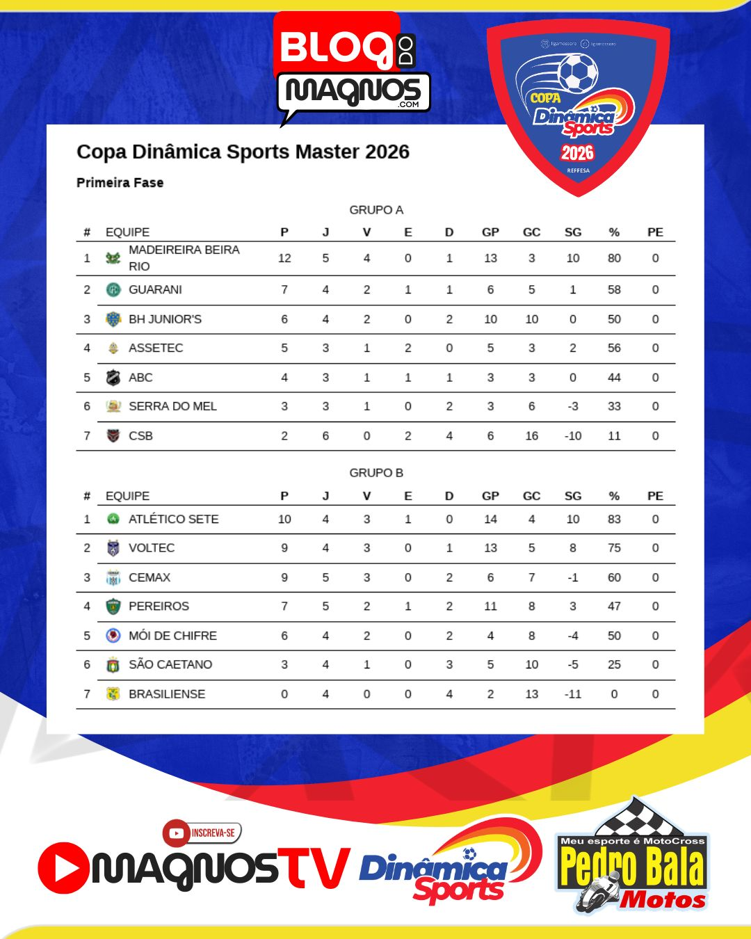 Os jogos deste sábado (25) da Copa Dinâmica Sports Master 2026 contaram com goleada do Pereiros e com a definição do primeiro time eliminado da competição.
